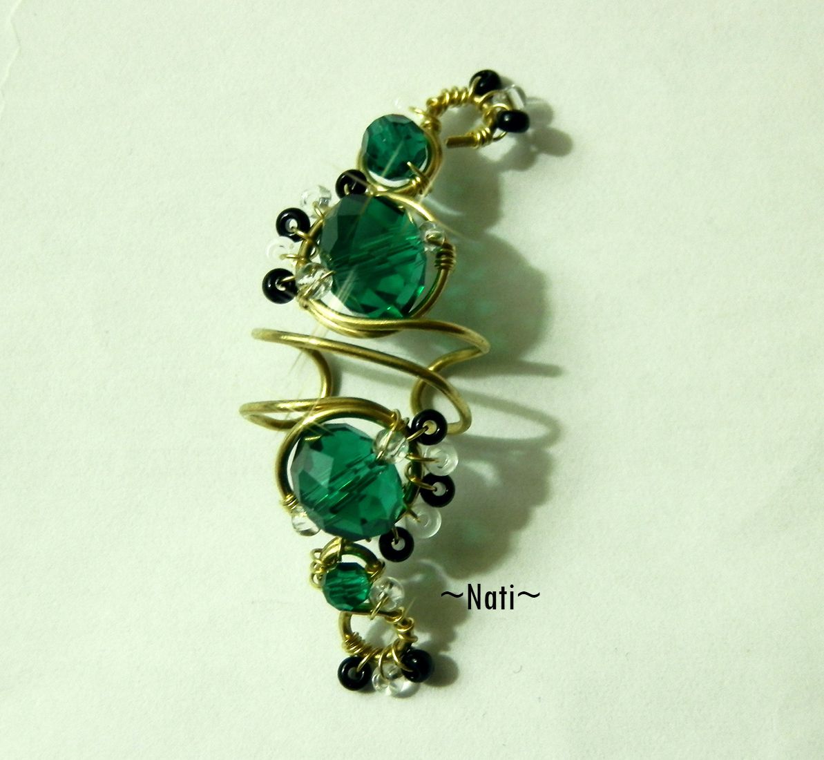 Кафф цвета изумруда! Для любительниц насыщенного зелёного. Для изготовления использована латунная проволока. Кафф украшен стеклянными бусинами сваровски и чешским бисером. Узнать подробнее о моём творчестве можно в моей группе: http://vk.com/vazanie_ot_nati. Так же мои украшения можно приобрести! в моём магазине