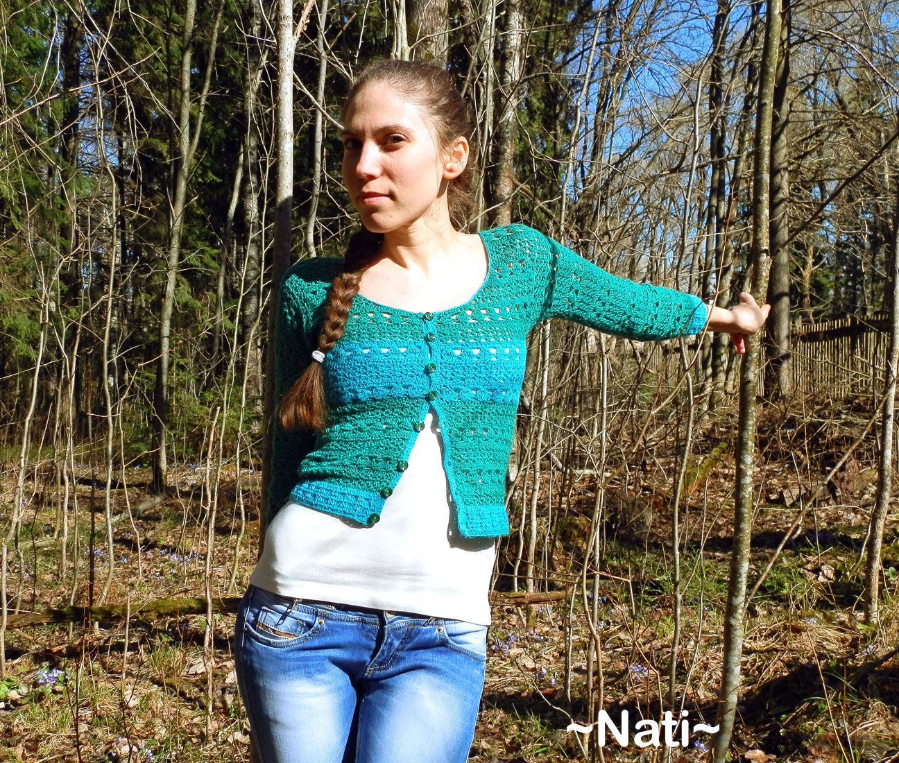 Мини жакет, связан крючком. Связан из тонкой шерсти. Очень удобный, не заменим для прохладных летних вечеров. Познакомится подробнее с моим творчеством можно в моей группе: http://vk.com/vazanie_ot_nati Схема и другие фото этого жакета по ссылке