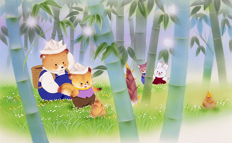 В иллюстрации животных бамбуковый лес, медведь родитель-ребенок и животных, которые пришли на бамбуковых побегов копать