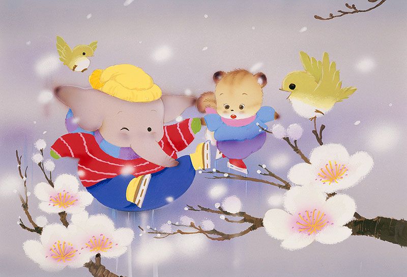 動物イラスト 梅の花、スケートをするゾウ、リス、小鳥達
