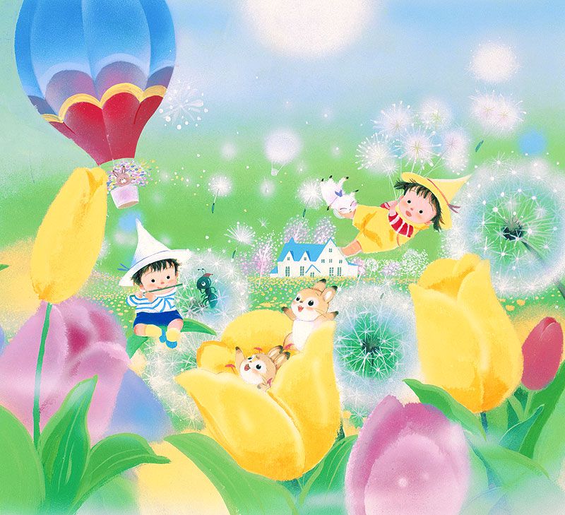 В животного иллюстрации тюльпан поля, дети, играющие с одуванчиком
