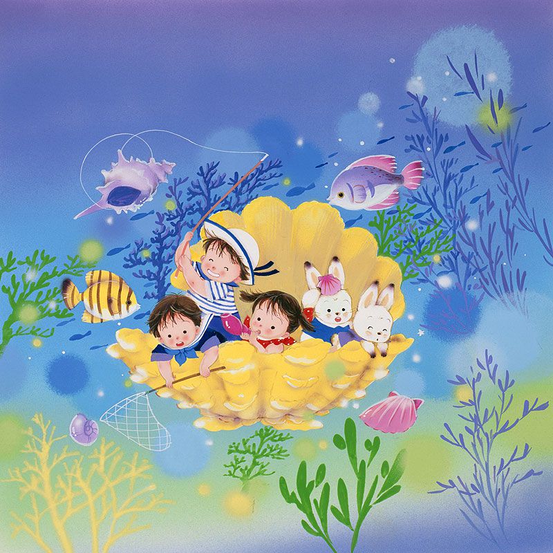 Подводные прогулки в лодке иллюстраций животных моллюсков. Трое детей и кролик