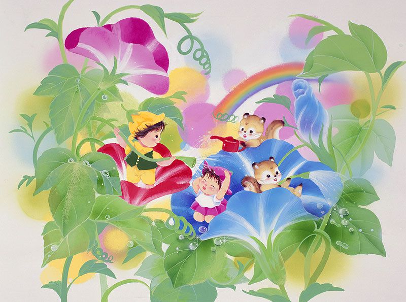 動物イラスト 朝顔のプールで遊ぶ妖精と動物たち