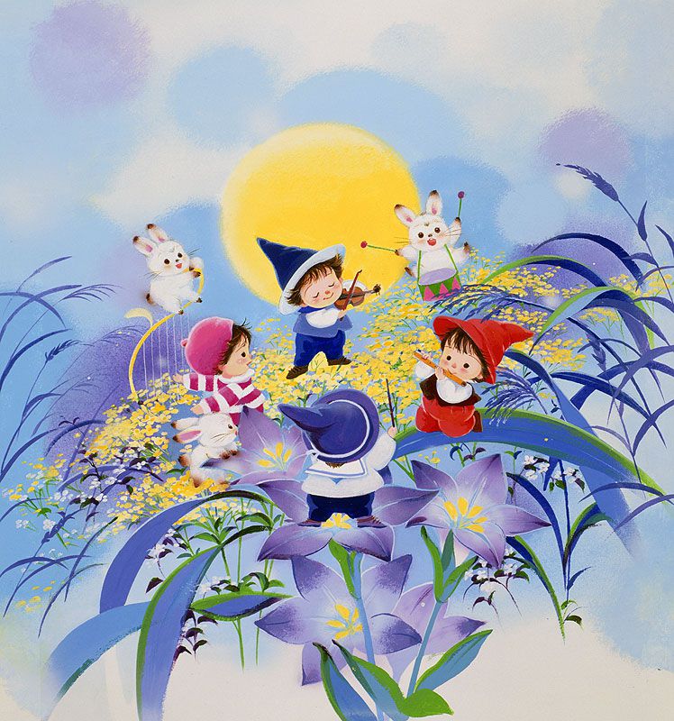 動物イラスト 月夜の演奏会。5人の妖精と虫たち