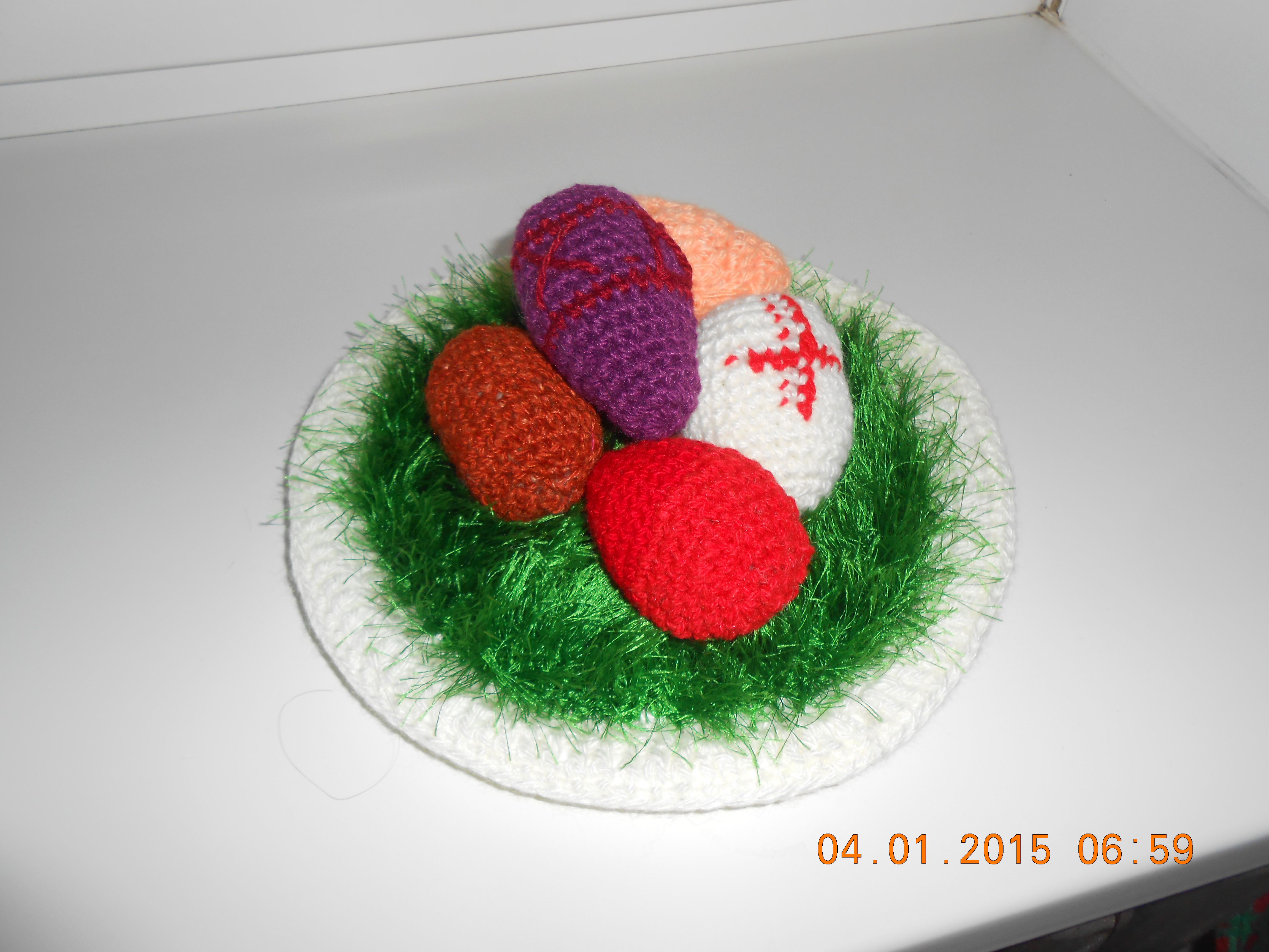 Для "Русской горницы". Пасхальные яйца на блюдечке с травкой.
