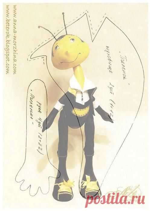 Чтобы ножки стояли, вшиваем в ступни плотный картон, выкроив его на 1мм меньше, нежели детали для подошвы. Готового Пчёлика раскрашиваем красками по ткани, и не забываем пройтись потом нулевой наждачкой - это для придания мягкости и бархатистости, ну и для того, чтобы убрать ненужный нам блеск от краски.