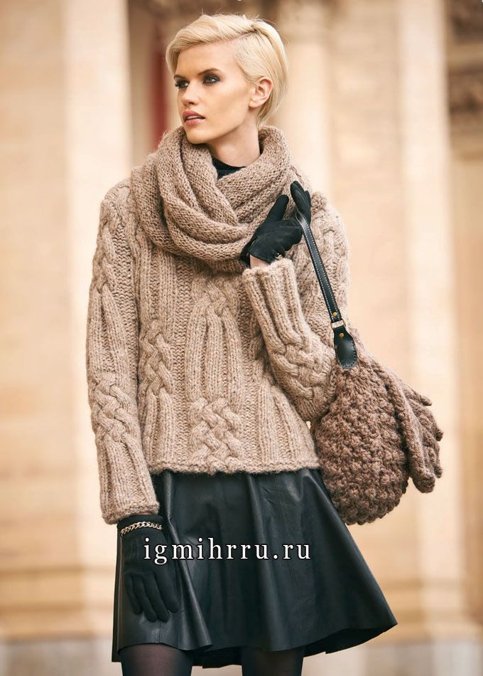 ТЕПЛЫЙ ВЫРАЗИТЕЛЬНЫЙ КОМПЛЕКТ В БЕЖЕВО-КОРИЧНЕВЫХ ТОНАХ: ПУЛОВЕР, ШАРФ-ХОМУТ И СУМКА