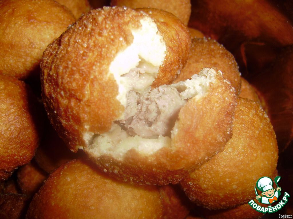 • Пока тесто подходит, делаем фарш, добавив к мясу лук, соль, перец, специи. Затем делаем пончики: тесто разделить на порционные шарики, руками разминаем в лепешку, посередине кладем начинку и, защипываем края, укладываем швом вниз.