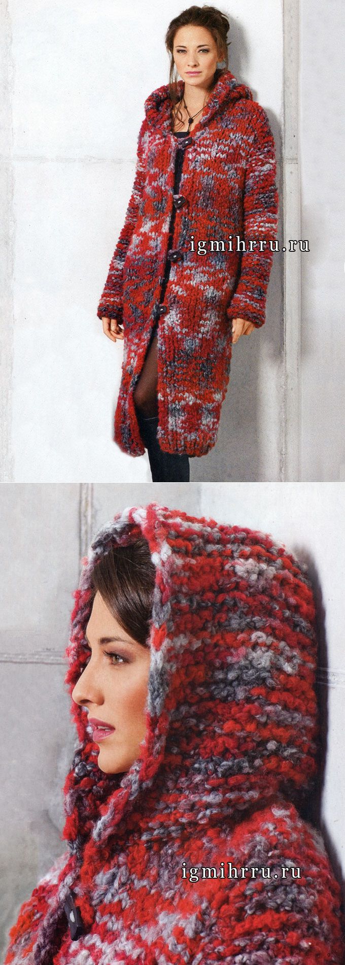 СТИЛЬНОЕ СЕРО-КРАСНОЕ ПАЛЬТО С КАПЮШОНОМ
