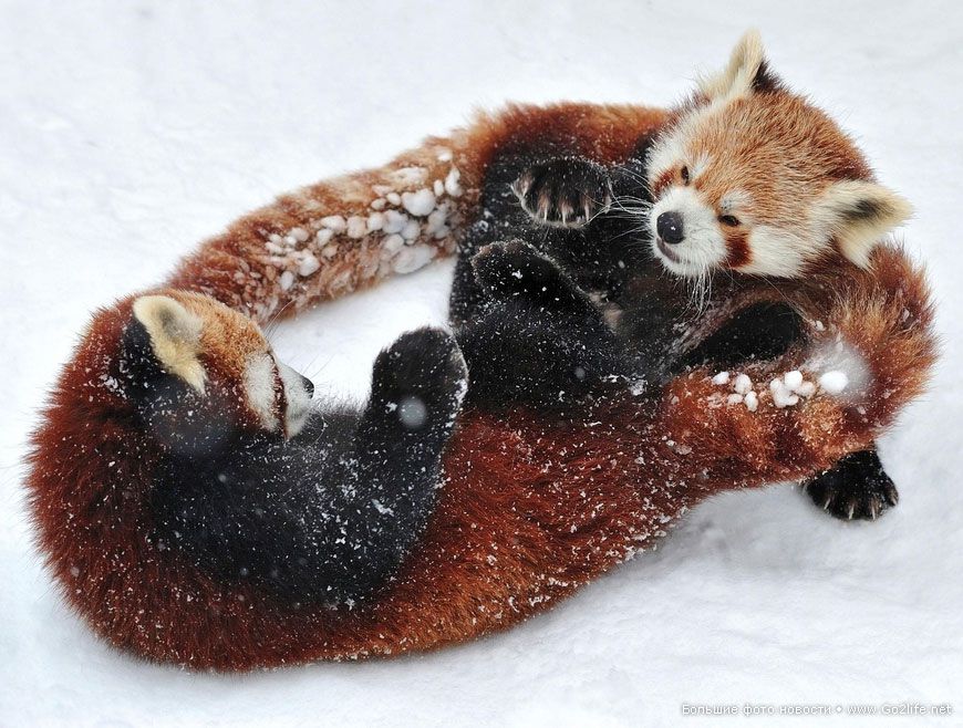 Нет настроения? Мега позитив: презабавные красные панды резвятся на снегу. Уж кто бы мог подумать, что эти милые зверюшки – красные панды (они же: малые панды), знают толк в зимних забавах, да еще могут так позитивно играться – прямо чудо природы какое-то!