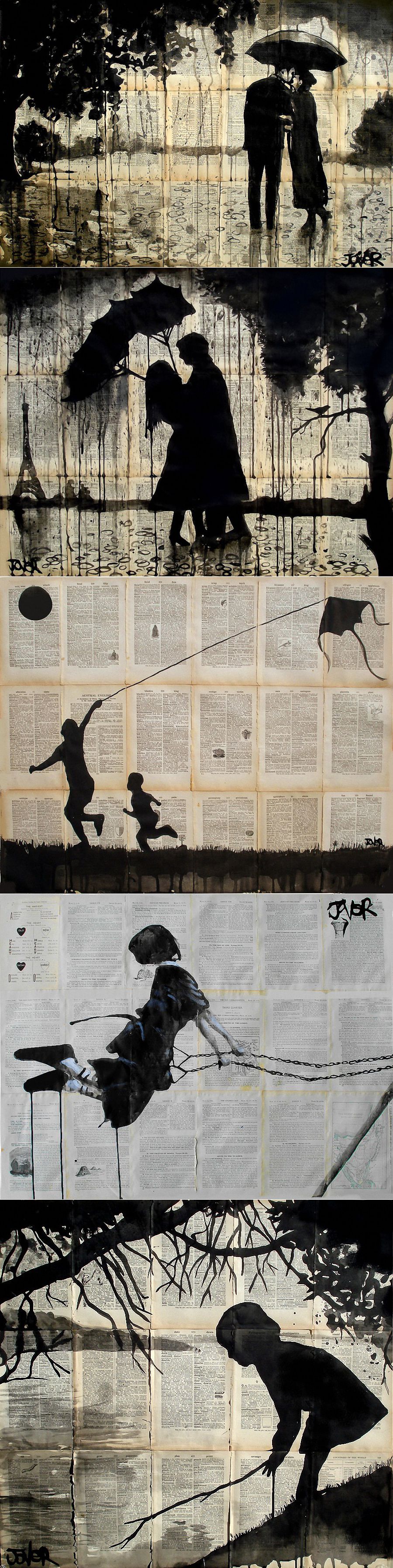 Австралийский иллюстратор Loui Jover рисует тушью (или чернилами) на полотнах, созданных из старых книжных страниц