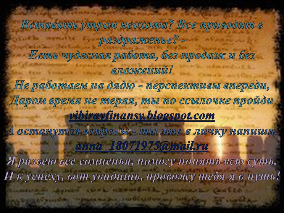 Идеальная работа — это та, которая приносит много денег и при этом занимает мало времени. Желательно еще, чтобы офис был в пяти минутах ходьбы от дома, зарплату платили вовремя, а начальник все время был в командировках. Ну, и свой отдельный кабинет не помешает, чтобы работать никто не мешал. Мечта? Раньше это было мечтой, теперь же стало реальностью. Подробнее на сайте http://vibirayfinansy.blogspot.com