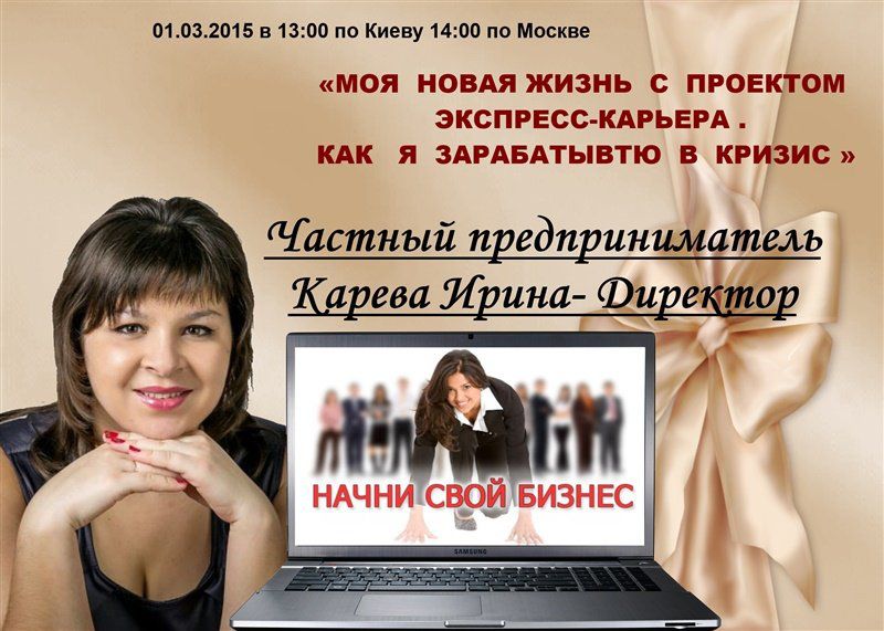 Ежедневная серия вебинаров от лидеров "Экспресс-Карьера - Стиль Жизни" для новичков и кандидатов - "Моя новая жизнь с проектом Экспресс-Карьера. Как я зарабатываю в кризис" В воскресенье, 1 марта, в 13.00 по Киеву, 14.00 по Москве, 17.00 по Астане по ссылке http://online-tour-of-leaders.blogspot.ru Ирина Карева - Директор