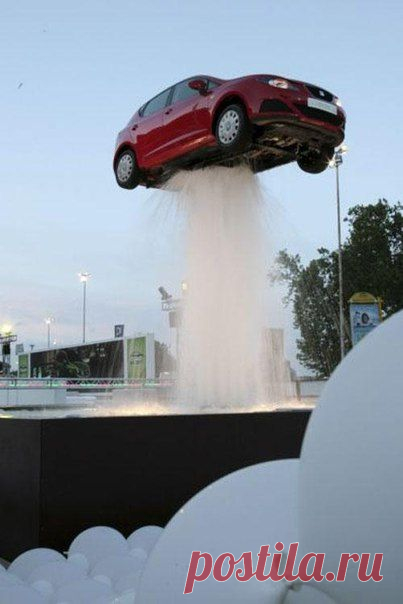 Несколько лет назад в центре Рима с легкой руки испанского скульптора Хуана Гальдеано (Juan Galdeano) забил уникальный фонтан. Казалось бы, мощность водной струи настолько велика, что в воздух взмыл самый настоящий автомобиль – трехдверный хэтчбек Seat Ibiza. На самом деле, конечно, это не вода держит машину...