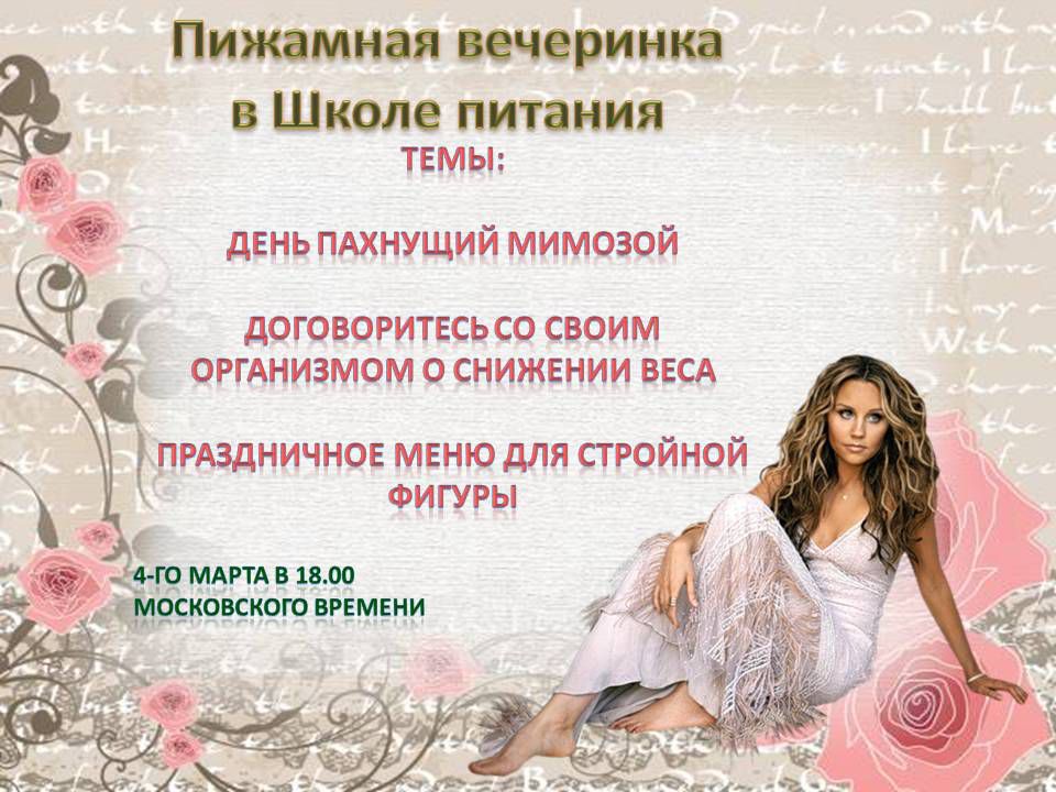 Милые дамы! Поздравляю Вас с наступающим Женским Днём и приглашаю весело и непринуждённо отпраздновать! Завтра в 18.00 по мск - Пижамная вечеринка! Берите с собой подружек и айда веселиться!