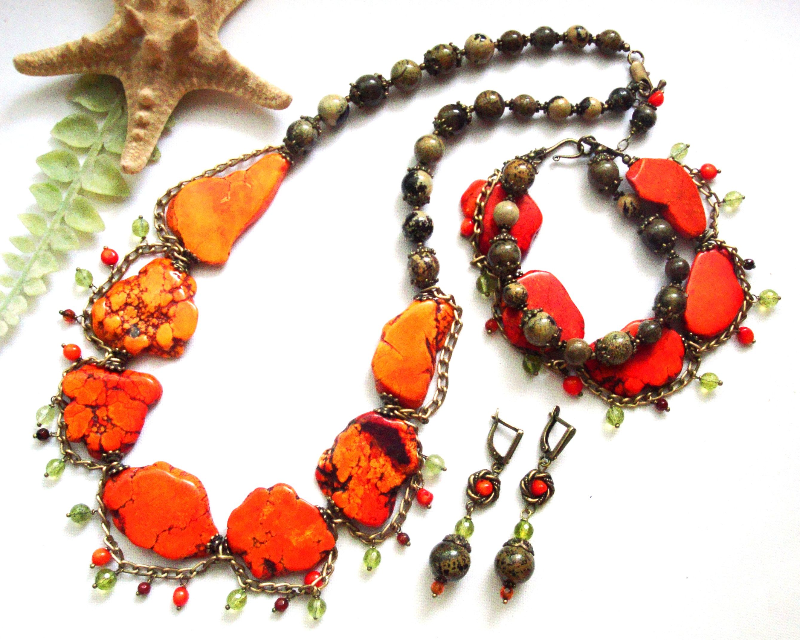 Комплект "Остров грёз". Говлит, яшма, коралл, кварц, сердолик.