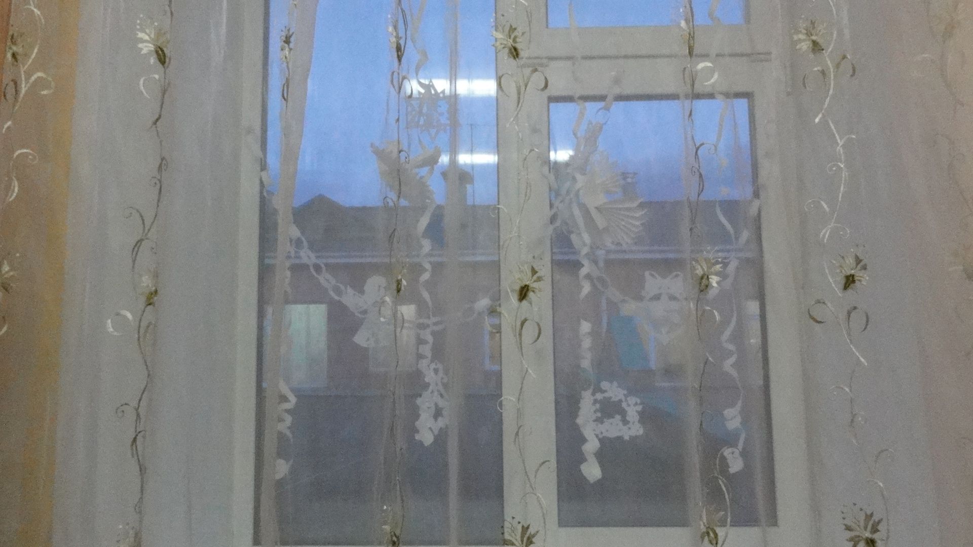 оформление окна ажурными снежинками, летящими голубями и свисающими льдинками