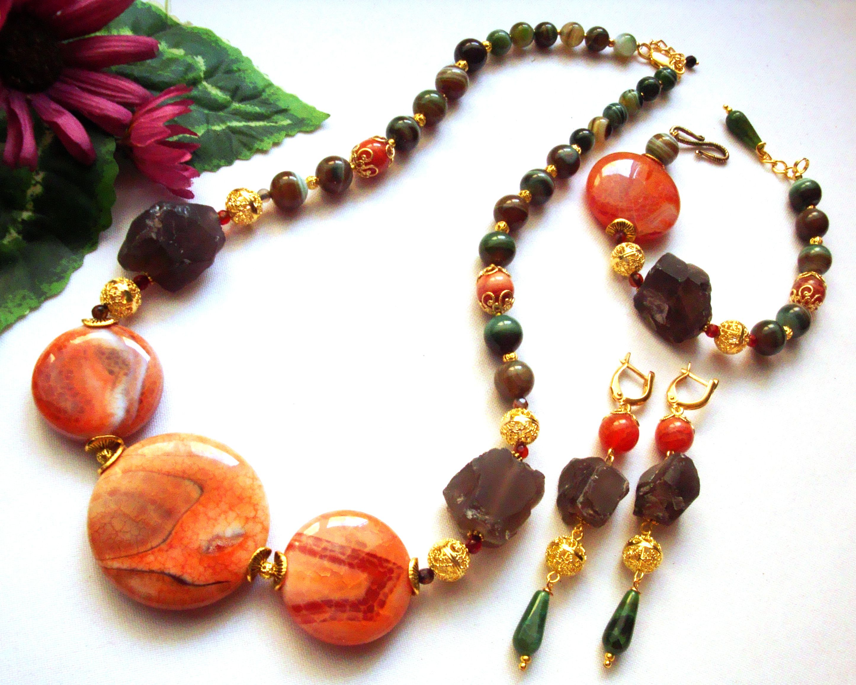 Комплект "Осенняя история". Агат, природные куски раухтопаза.