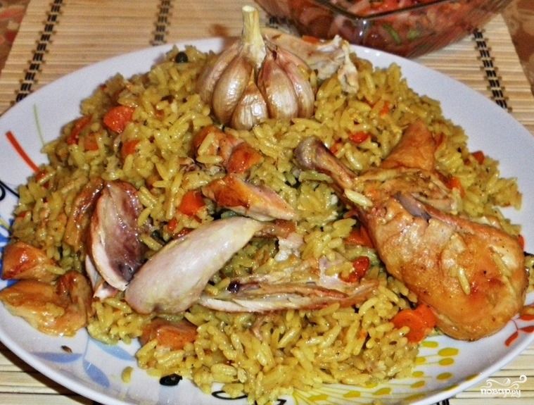 • Начнем с того, что нальем в казан или другую толстостенную посуду растительное масло и поставим его на огонь. В разогретое масло выкладываем нарезанный на четвертькольца репчатый лук, жарим его до золотистого цвета. Куриные голени промываем, вытираем насухо и выкладываем в казан к луку, жарим все вместе еще несколько минут. Затем выкладываем в казан нарезанную на половинки кружочков морковь, еще 3-4 минуты жарим все, помешивая. Пока курица с овощами жарится, мы подготавливаем свои любимые специи, чеснок чистим и раздавливаем его плоской стороной ножа. Закладываем подготовленные специи в казан, солим все по вкусу и тушим курицу под крышкой в течение 15-20 минут. Рис тем временем промываем в холодной воде несколько раз. Когда 20 минут пройдет, выкладываем в казан промытый рис. Вливаем в казан воду, она должна на 1,5 см подниматься над рисом, добавляем еще соль и перец, если нужно. На медленно огне под крышкой готовим плов 10-15 минут. Когда рис впитает верхний слой воды, открываем крышку и опускаем в середину казана целую головку чеснока, делаем в рисе несколько сквозных отверстий для выхода пара. Опять накрываем казан крышкой и еще 15-20 минут готовим плов. За это время рис должен полностью приготовиться и стать мягким, поэтому мы выключаем огонь и перемешиваем содержимое казана, подаем плов к столу. Приятного всем аппетита!