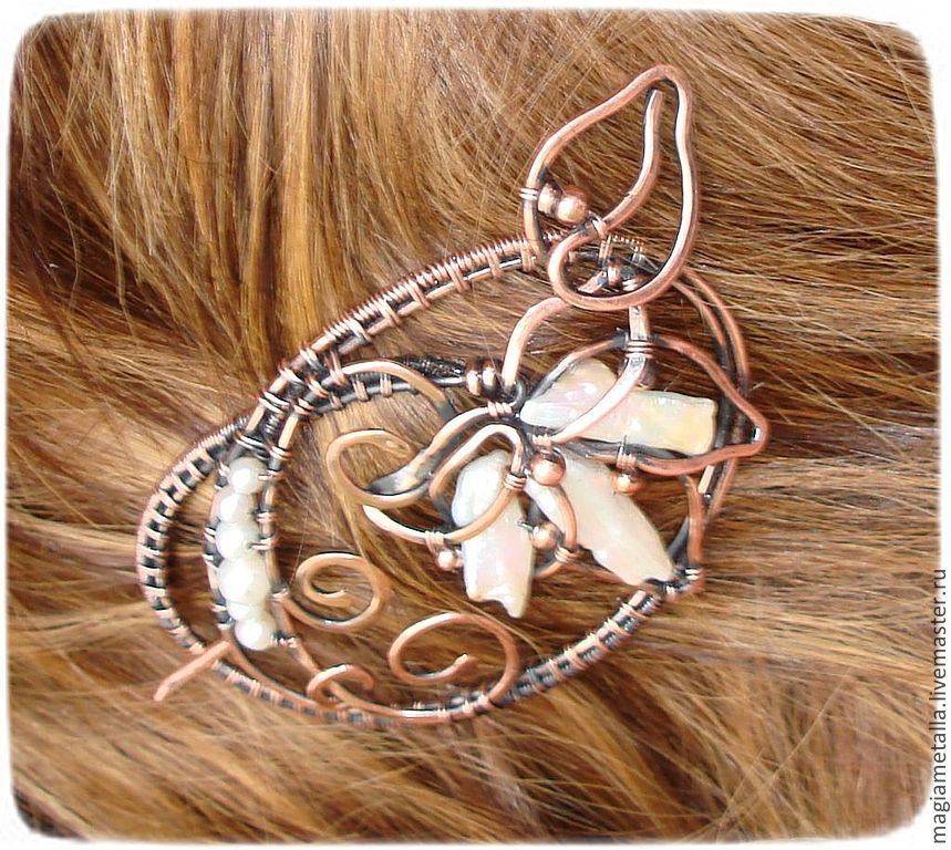 Заколка "Лотос" фибула медная с жемчугом. - медь,Медь ручной работы,медь патинированная