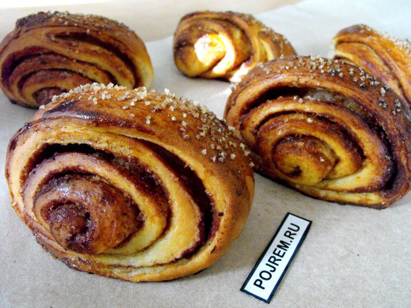 - Как приготовитьРастворить дрожжи в теплом молоке с 65 г сахара, присыпать 1-2 ст.л. муки и оставить на 15 мин для ферментации. Добавить муку, соль, замесить тесто. Добавить кардамон и 75 г размягченного сливочного масла, снова месить (если руками, около 20 мин, в комбайне - 8-10 мин). Должно получиться очень мягкое, нежное тесто. Собрать тесто в шар и поместить в глубокую посуду для подъема. Посуду необходимо герметично накрыть пищевой пленкой и оставить в теплом месте на 1-1,5 часа. Тесто должно увеличиться вдвое. В пиале смешать 2 ст.л. корицы с 2 ст.л. сахара. Готовое тесто хорошенько обмять руками и раскатать в квадрат около 45 см. Равномерно смазать поверхность теста 25 г размягченного сливочного мала, отступая 1 см от края по всему периметру квадрата, и посыпать смесью сахара с корицей. Свернуть квадрат в рулет, скрепляя края. Нарезать рулет очень острым ножом на одинаковые фигуры-трапеции. Выложить фигуры из теста на противень, покрытый пекарской бумагой, на расстоянии 5 см друг от друга широкой частью трапеции вниз. Каждую "трапецию" немного приплюснуть плоской лопаткой. Накрыть кухонным полотенцем и оставить на 40 минут для подъема. Затем смазать каждую булочку желтком, разведенным 1 ст.л. молока, и присыпать коричневым или белым сахаром (не обязательно). Выпекать при 210-220С около 15-25 минут до приобретения булочками золотисто-коричневого оттенка. Остудить на решетке. Приятного чаепития!
