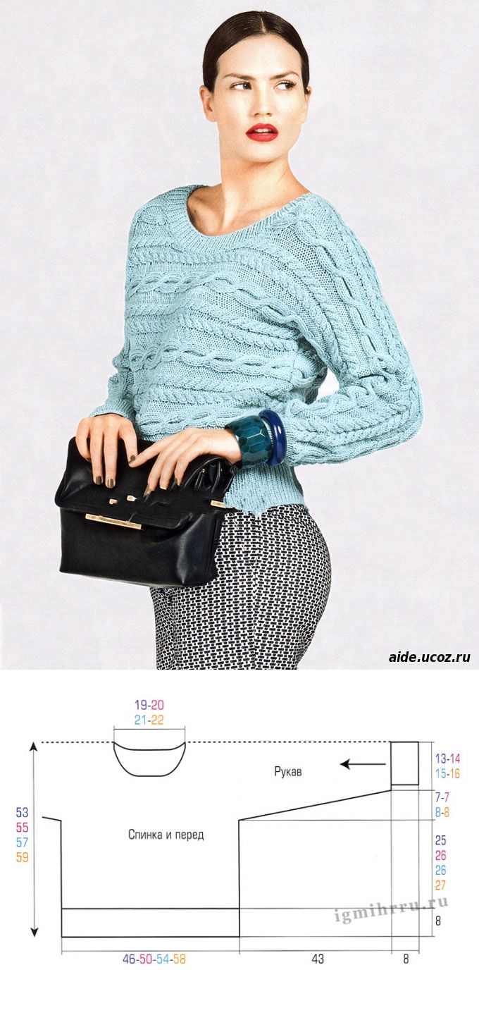 Светло-бирюзовый пуловер с косами, связанный единым полотном в поперечном направлении, от Bergere de France. Спицы - Женские вещи - Вязание спицами. - Каталог файлов - Хобби.