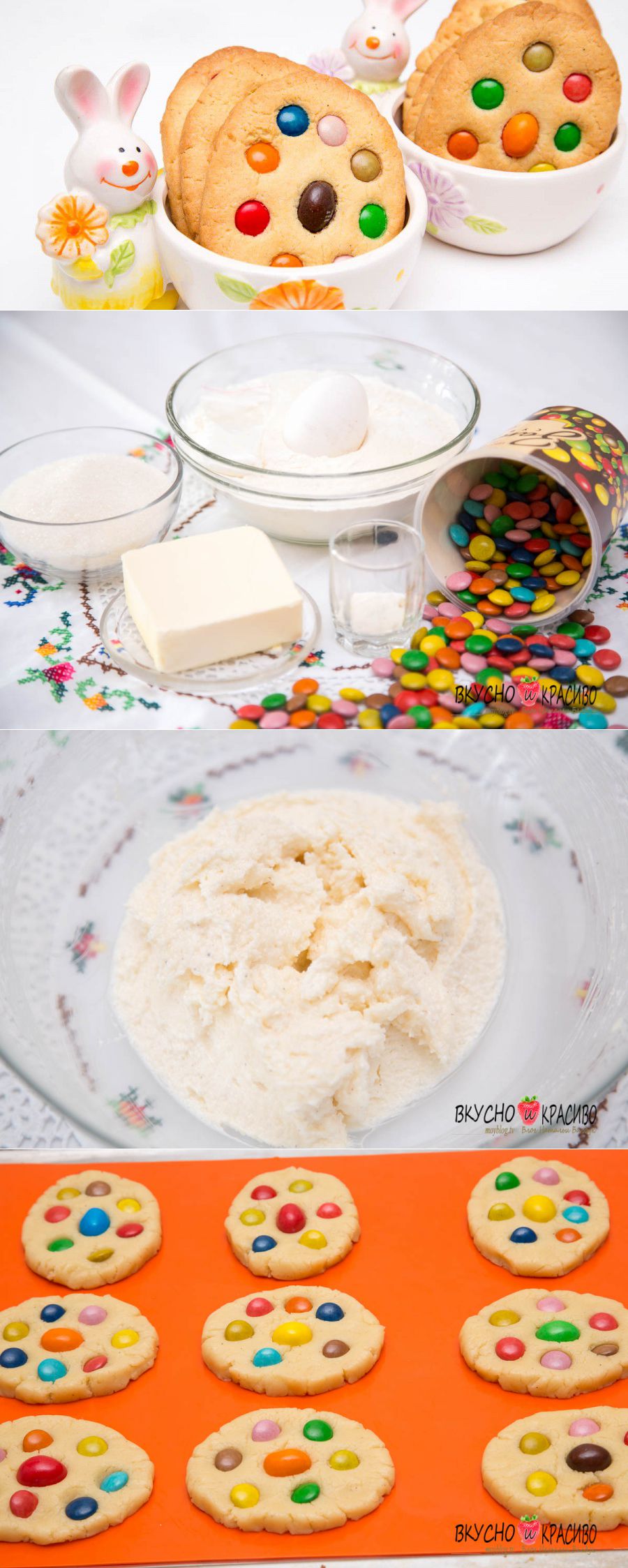 Печенье "Пасхальные яйца" | Вкусно и красиво с Натальей Балдук. на 14 шт. 130 г слив. масла или маргарина жирн. комн. темп. 150 г сахара 1 крупное яйцо 1 пакетик ван. сах. 300 -330 гр муки 1/2 ч.л. разрыхлителя соль щепоточка 100 г M&M’s
