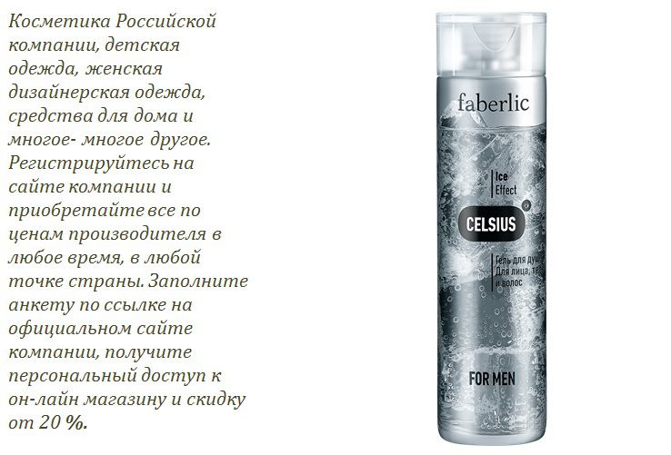 Гель для душа – для лица, тела и волос: 3 в 1: многофункциональный продукт, который подходит для ежедневного ухода за кожей лица, тела и волосами. Имеет выраженный охлаждающий эффект. Заряжает энергией и наполняет свежестью. Превосходно дезодорирует. Удобно брать с собой в поездки – теперь вам не потребуется 3 средства! Гель для душа можно приобрести на сайте компании после бесплатной он-лайн регистрации.