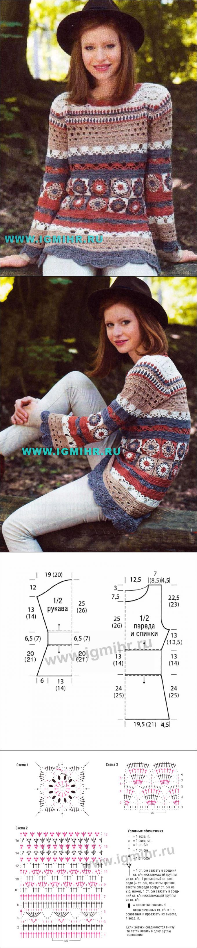 Разноцветный пуловер из квадратов и декоративных узоров. Крючок_igmihr.ru