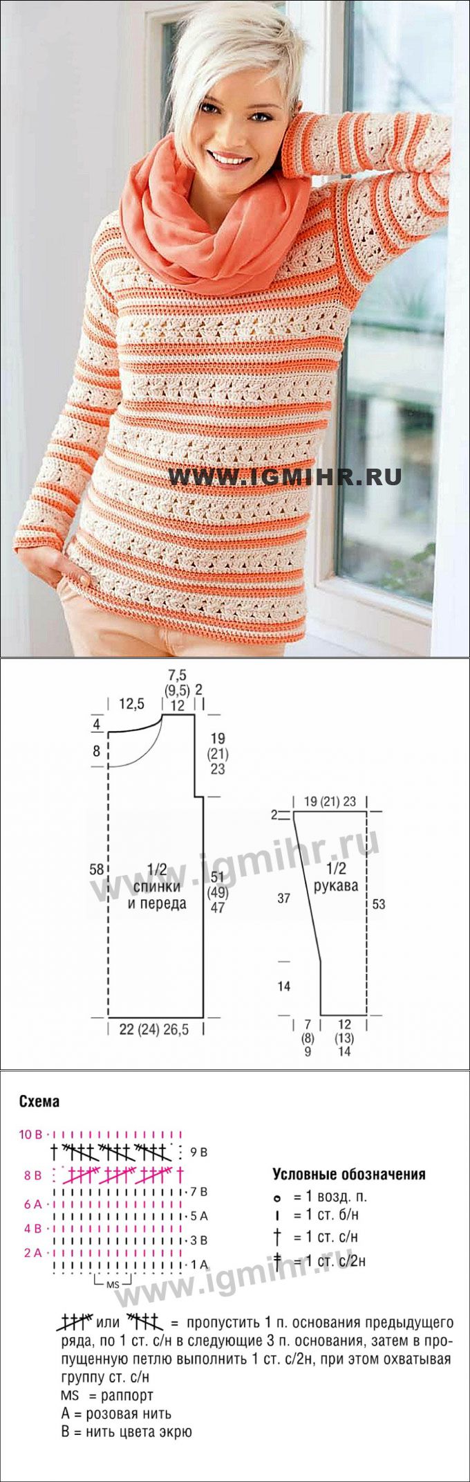 Пуловер в оттенках розового и цвета экрю, с полосками и фантазийным узором. Крючок_igmihr.ru