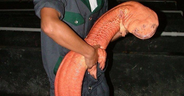 Китайская гигантская саламандра почти слепая, что не мешает ей считаться рекордсменом среди амфибий, вырастая в длину до двух метров.