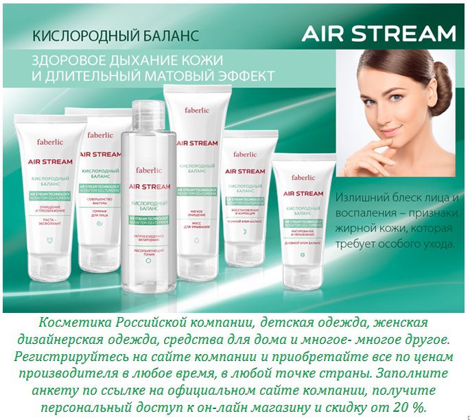 Здоровое дыхание вашей кожи и длительный матовый эффект с новой серией Air Stream! Продукты линии «Кислородный баланс» восстанавливают и поддерживают оптимальный водно-жировой баланс кожи, избавляя ее от жирного блеска, выравнивая рельеф и наполняя здоровьем и красотой. Паста-эксфолиант (0214); Гоммаж для лица (0203); Абсорбирующий тоник (0211); Мусс для умывания (0201); Дневной крем-баланс (0212); Ночной крем-баланс (0213); Ознакомиться и заказать продукцию можно на сайте: