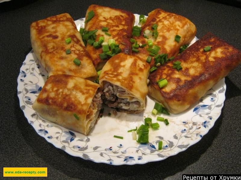 - Шаг 1: Приготовим вкусные блинчики, подготовив все нужные нам ингредиенты. Кстати, в одной кулинарной книге, из которой я узнала, как пожарить блины с мясом и рисом, такие блины называются скородумками, потому что они без дрожжей и быстро готовятся.Шаг 2: Готовим блинное тесто. Сначала взбиваем венчиком до пышности яйца с добавлением соли, затем вливаем в них теплое молоко и перемешиваем. В эту массу добавляем просеянную муку и растительное масло. Все тщательно перемешиваем. Тесто готово.Шаг 3: Выпекаем блины на раскаленной сковороде, смазанной растительным маслом - смазываем сковороду только перед первым блином. Жарим с двух сторон примерно по 40-50 секунд на сильном огне. Используем все тесто.Шаг 4: Приготовим начинку. Берем головку репчатого лука и шинкуем её очень мелко. Соединяем лук с фаршем и перемешиваем.Шаг 5: Прогреваем на сковороде растительное масло, выкладываем смесь из фарша с луком и обжариваем до готовности на умеренном огне при помешивании - это примерно 10-15 минут. Фарш заправляем солью, перцем и прибавляем для запаха немного розмарина.Шаг 6: Отвариваем рис, охлаждаем его и перемешиваем с готовым мясным фаршем. Начинка готова.Шаг 7: Теперь приступаем к фаршировке. Для этого в центр каждого блина выкладываем начинку - примерно по столовой ложке.Шаг 8: Сворачиваем блины в форме конверта.Шаг 9: Каждый конвертик обжариваем на сковороде со сливочном маслом с двух сторон до появления румяной корочки. При подаче можно поспать блины измельченной зеленью.Шаг 10: К таким динам хорошо подойдет сметана. Они вкуснее в горячем виде, поэтому не ждите, пока они остынут, а кушайте их сразу, как говорится, с пылу-с жару!Шаг 11: Приятного аппетита!