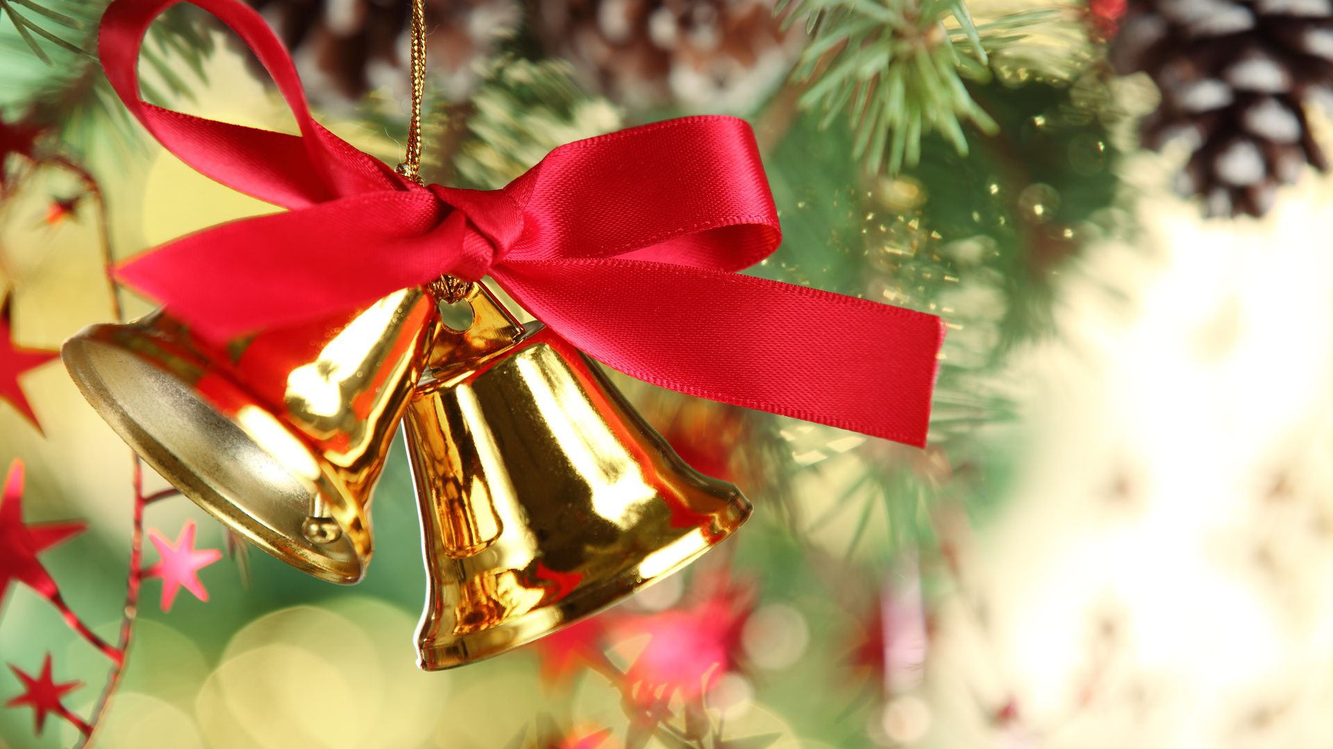1920x1080 лента, шишка, ёлочные украшения, Колокольчики, ёлка картинки на рабочий стол 64948