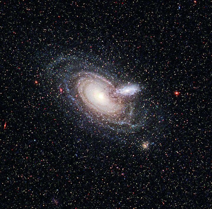 9. "Хаббл" запечатлел редкий момент расположения на одной линии двух спиральных галактик: первая, небольшая, упирается в центр более крупной.