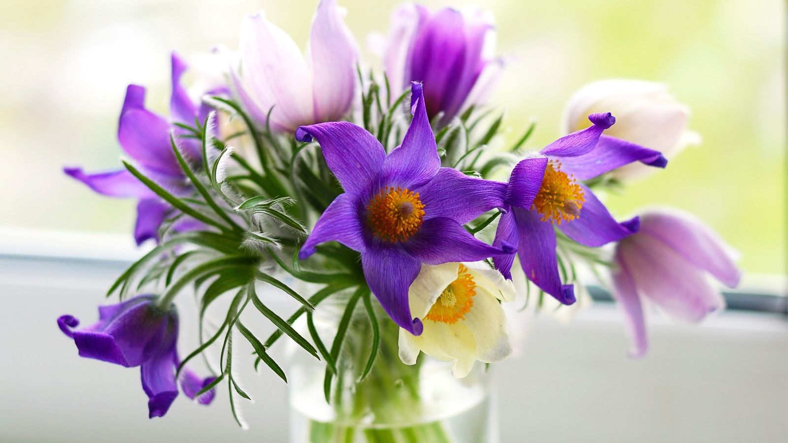 Картинка pulsat__lla, прострел, фиолетовые, букет, розовые, цветы 1600x900, фото 170762