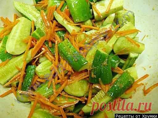 - Шаг 1: Этот рецепт подразумевает использование даже подвявших и переспевших огурцов, и мелкой моркови. Рецепт салата огурцы по-корейски на зиму с морковью легкий в приготовлении. Приправу для корейской моркови можно использовать как готовую, которая продается в магазине, так и смешать специи самостоятельно (паприку, красный острый перец, кориандр). Также нам понадобится уксус, растительное масло, соль и сахар.Шаг 2: Огурцы замачиваем в холодной воде на пару часов. Таким образом мы избавим их от горечи, огурцы станут более хрустящими.Шаг 3: Морковь натираем на терке для корейской моркови, перекладываем в миску, слегка солим, и немного мнем руками, чтобы она стала немного мягче. Если нет специальной терки, можно нарезать морковь ножом тонкой соломкой. Соль берем от общего количества, указанного в рецепте.Шаг 4: У огурцов срезаем хвостики с двух сторон, и нарезаем толстой соломкой. Можно использовать для нарезки специальный фигурный нож (такой нож используется для нарезка сыра). Если у вас огурцы с семенами, или толстой кожицей, то семена, и кожицу, лучше удалить.Шаг 5: Огурцы и морковь перекладываем в глубокую миску, лучше в кастрюлю, чтобы можно было хорошо перемешивать.Шаг 6: Чеснок очищаем, зубчики измельчаем через пресс. Добавляем к чесноку оставшуюся соль, добавляем сахар, и специи. Вы можете купить такие специи: паприка, красный острый перец, кориандр. Смешать, и взять нужное количество, а можно, купить в магазине приправы для корейской моркови. Если используете готовую приправу, то ее потребуется 20 граммов.Шаг 7: В миску к специям и чесноку добавляем уксус и растительное масло, все хорошо перемешиваем ложкой. Стараемся растворить соль и сахар. Скорее всего, сделать так чтобы соль и сахар полностью растаяли не удастся.Шаг 8: Вливаем специи с маслом и уксусом. Все хорошо перемешиваем, и оставляем на 1.5-2 часа для выделения овощами сока. Уже спустя 1.5 часа овощи пустят достаточное количество сока, но еще лучше оставить на ночь.Шаг 9: Тем временем займемся банками и крышками. Моем их пищевой содой без моющих средств, и стерилизуем над паром, или в духовке, или на чайнике, как Вам удобнее. Крышки нужно вымыть и прокипятить в воде 5-10 минутШаг 10: Салат раскладываем в стерильные банки. Красивее салат огурцы по-корейски на зиму с морковью смотрится в маленьких банках. Аккуратно у стенки банки укладываем кусочки огурцов, в центр насыпаем салат как получится, а сверху выкладываем морковь.Шаг 11: Сверху заливаем банку выделившимся соком до самого верха. Из указанного количества продуктов получается чуть больше 2 литров салата огурцы по-корейски на зиму с морковью.Шаг 12: Ставим банки в большую кастрюлю, прикрываем крышками, заливаем водой по плечики банок и кипятим банки 0,5 л - 10 минут, 0,7 л - 15 минут, 1 л - 25 минут. Закатываем (закручиваем) крышки, укутываем банки в полотенце и оставляем до полного остывания. На хранение убираем в прохладное место.