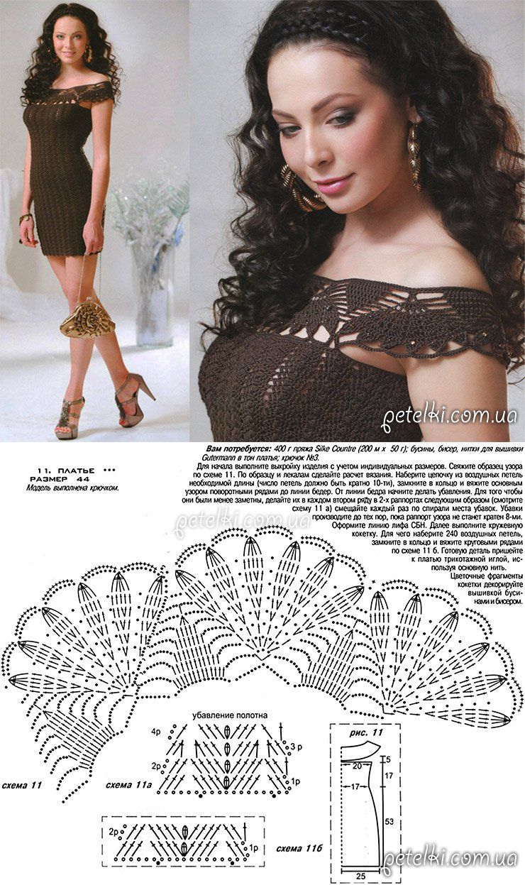 Прямое платье с ажурной кокеткой крючком. Описание, схемы