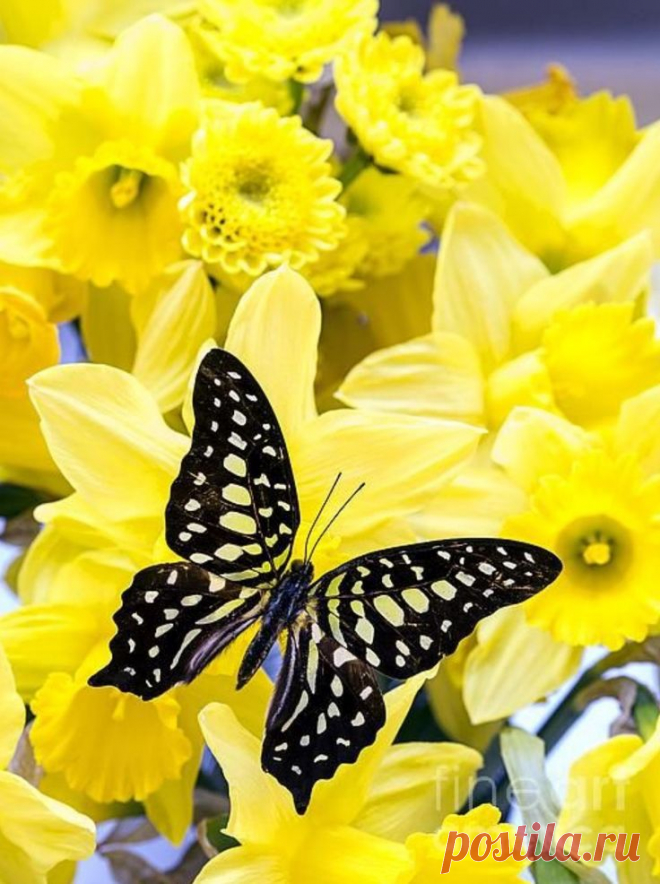 Graphium agamemnon - Графиум. Этот обширный род насчитывает около 100 видов, обитающих в южной Африке, а также на островах Юго-Восточной Азии и Океании. / Butterfly between the daffodils - Print by Edward Fielding/ Butterfly between the daffodils - Print by Edward Fielding | Papillons