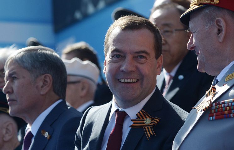 МОСКВА, 9 мая. /ТАСС/. Премьер-министр России Дмитрий Медведев поздравил россиян с 70-й годовщиной Победы в Великой Отечественной войне. "С Днем Великой Победы!" - написал глава правительства на своей страничке в социальной сети Facebook. / Премьер-министр РФ Дмитрий Медведев (в центре) © Алексей Никольский/пресс-служба президента РФ/ТАСС | ТАСС: Общество - Медведев поздравил россиян с Днем Победы и опубликовал фотографии с парада