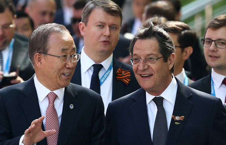 Генсек ООН отметил,что видел, как после парада на улицах остались сотни тысяч людей."Сначала я думал, что они проводят демонстрацию против вашего правительства, но я увидел, что нет, - они, наоборот, приветствовали ваше правительство. Я увидел, что они делали это с гордостью.." /Ген. секрет. ООН Пан Ги Мун и президент Республики Кипр Никос Анастасиадис © Станислав Красильников/ТАСС |ТАСС: Международная панорама - Пан Ги Мун отметил радостную атмосферу на праздновании Победы в Москве