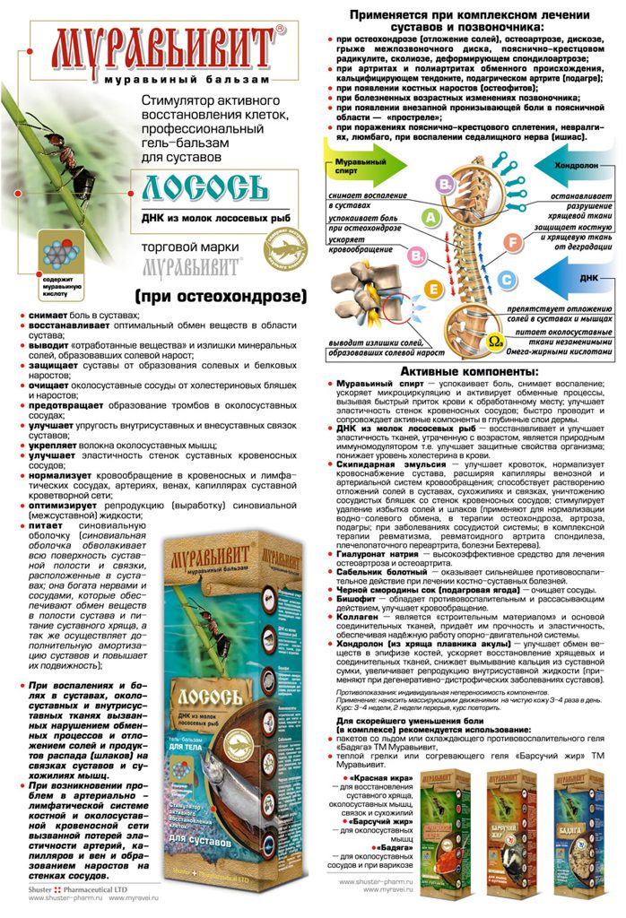 Стимулятор активного восстановления клеток, профессиональный гель-бальзам для суставов «Лосось» (ДНК из молок лососевых рыб) (при остеохондрозе) - снимает боль; - выводит излишки солей; - предотвращает образование тромбов сосудах; - улучшает эластич-ть сосудов Противопоказания: индивидуальная непереносимость компонентов. Применение: наносить массирующими движениями на чистую кожу 3-4 раза в день. Курс: 3-4 недели, 2 недели перерыв, курс повторить.