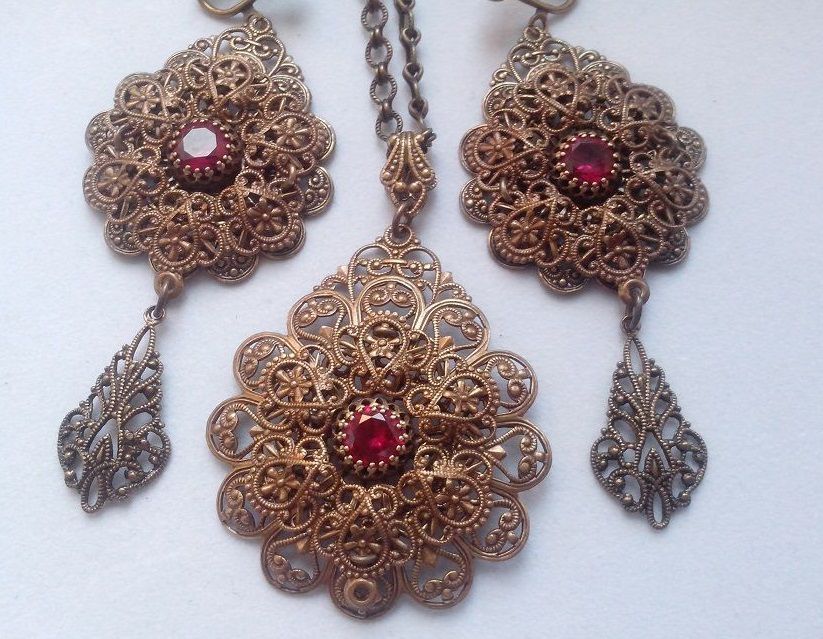 Винтажный комплект с рубинами Работа выполнена с использованием винтажной фурнитуры производства США и Израиля, а также лабораторных рубинов ювелирной огранки.