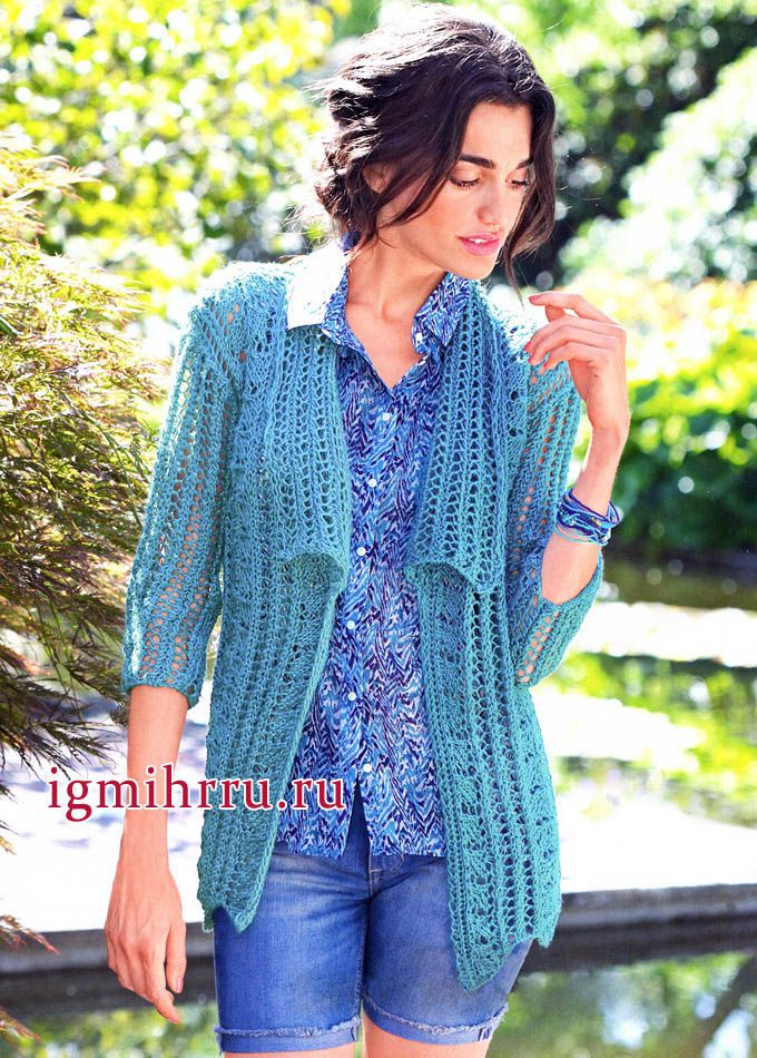 БИРЮЗОВЫЙ ЖАКЕТ С ОБЪЕМНЫМ СЕТЧАТЫМ УЗОРОМ