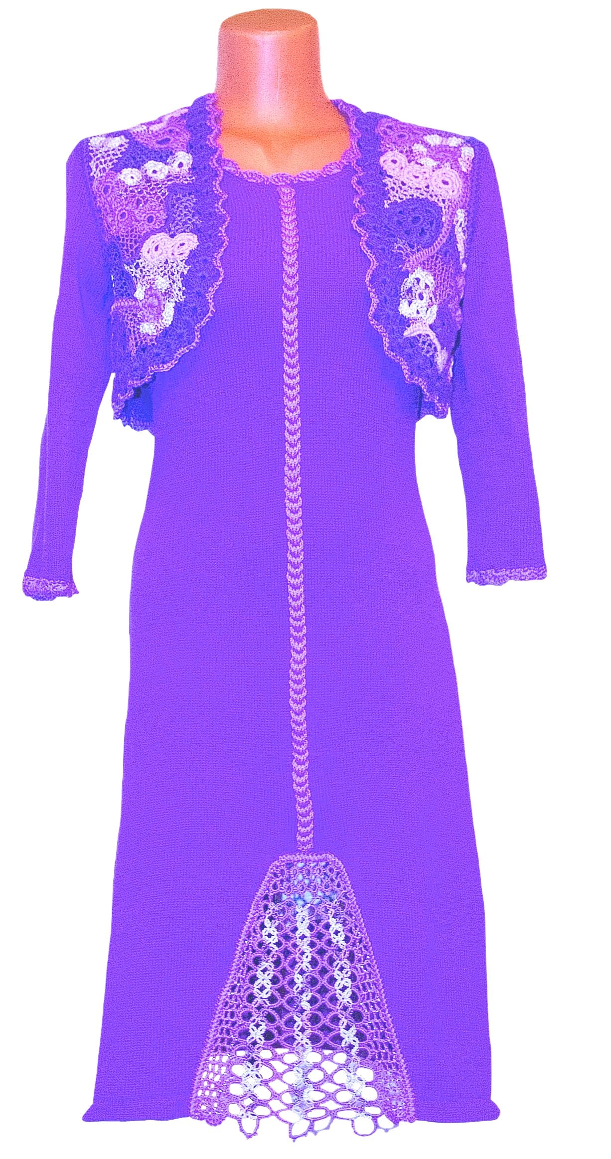 Dress Violet Fabrication: Finished work Description Dress complete with Bolero. The model is based on machine knitted with crochet trim and hand-made lace tatting. Used in the manufacture of yarn 100% cotton yarn with lurex. Dress Bolero complements with partial execution in the technique of inlaid lace (Irish lace). The price is just for the dress.