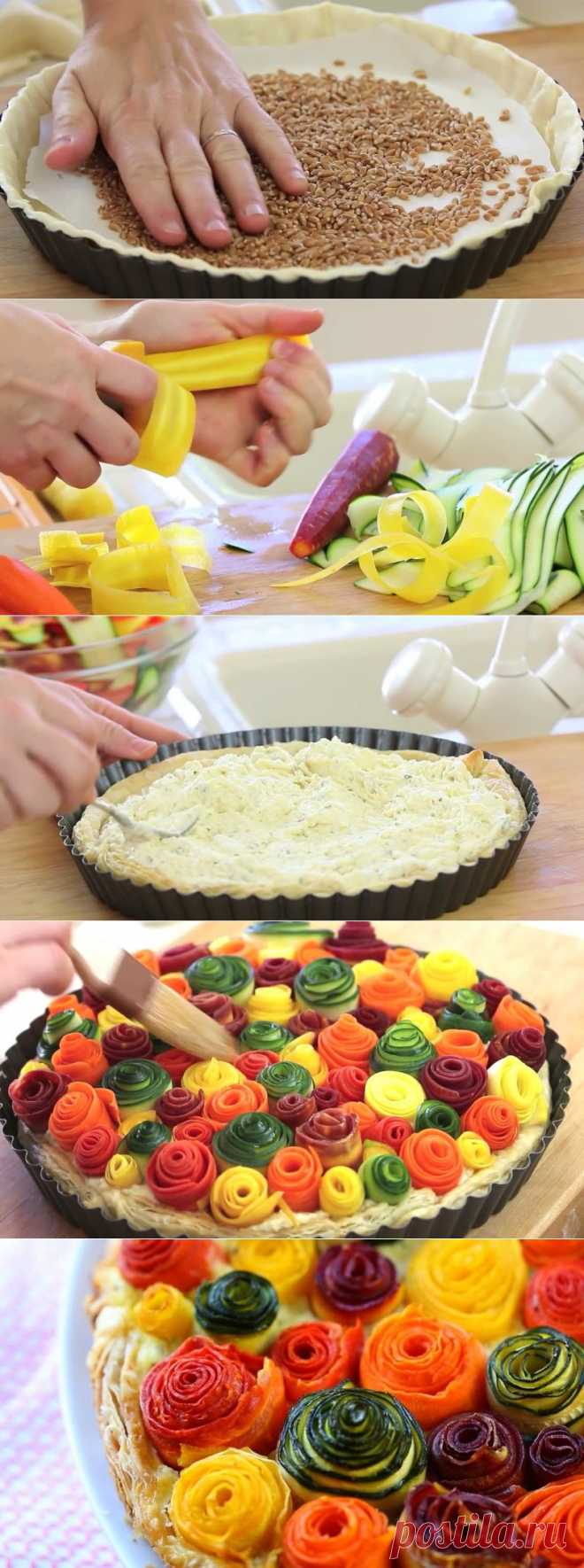 ПИРОГ С ОВОЩНЫМИ РОЗОЧКАМИ !!! **Тесто слоеное 1уп, бобовые 200г -горох или фасоль для груза, морковь цветная 4шт, цукини желтый и зеленый 2шт, Ррикотта 350г -мягк/творог или твор/сыр, яйцо 2шт, терт/сыр 80г, олив/масло 2ст/л, Моцарелла 130г, порошок мускат/ореха 1щ, орегано или базилик 1ч/л.