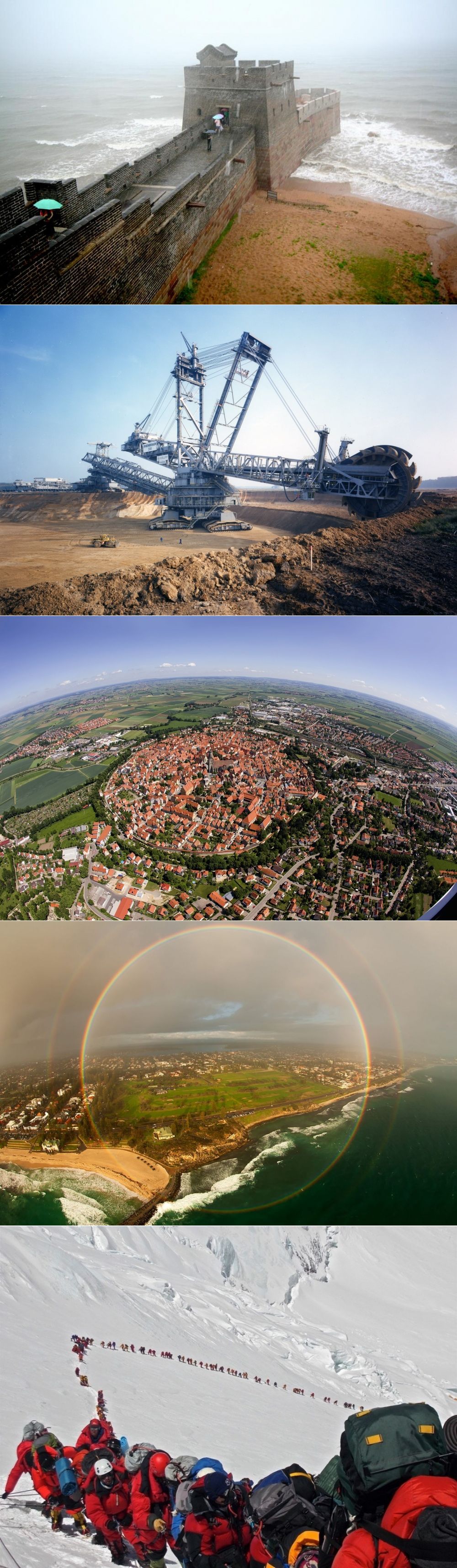 18 фотографий, которые открывают мир с новой стороны Восхождение на Эверест, май 2013 г.Полная радуга, сфотографированная с борта самолета.Город Нердлинген Баварский, который был построен в кратере метеорита, упавшего около 14 миллионов лет назад. Bagger 288. Самый большой экскаватор в миреИменно здесь, в уезде Шаньхайгуань, на берегу моря начинается Великая Китайская стена. Э