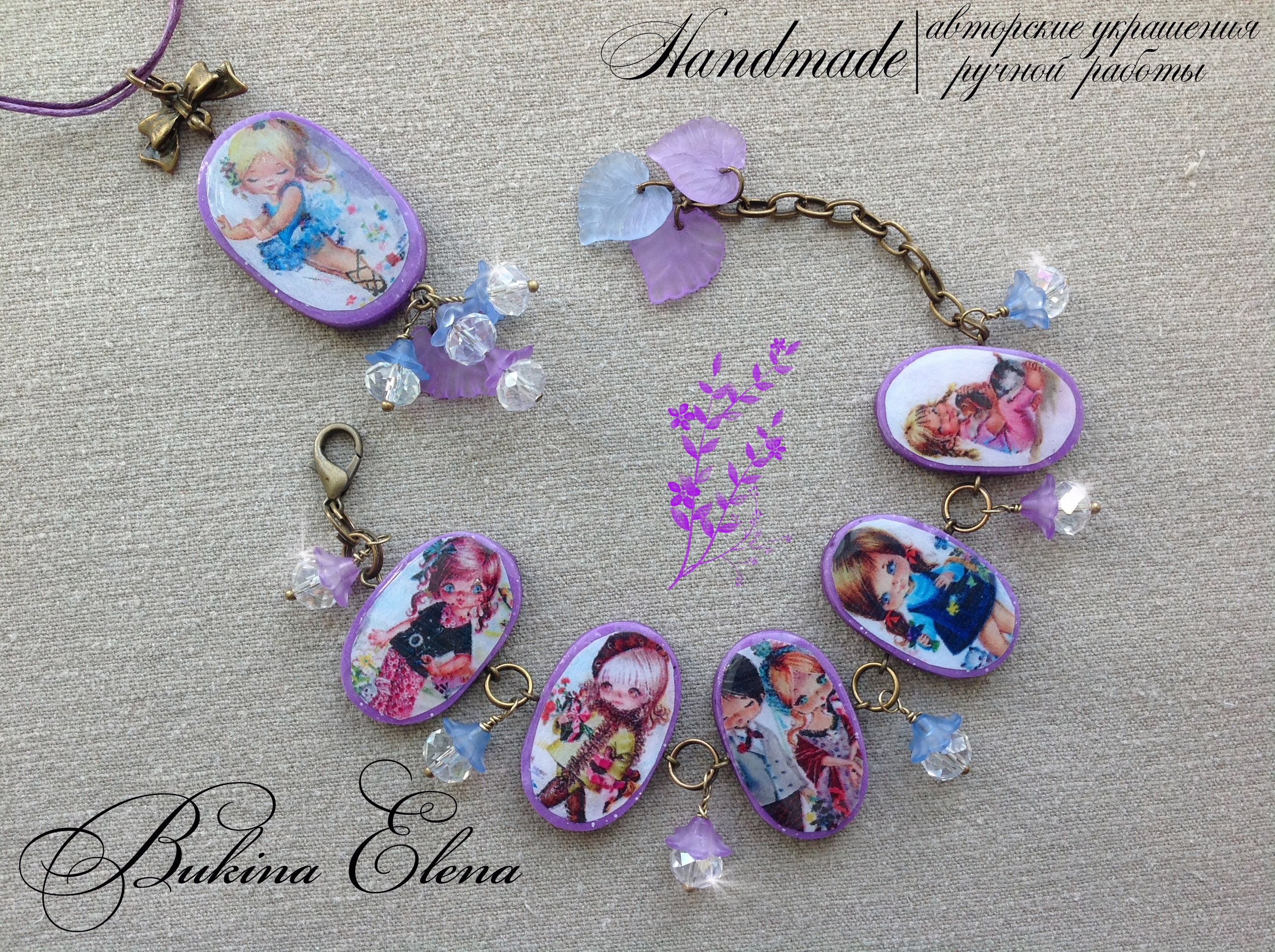 Браслет с подвеской из полимерной глины, покрыт эпоксидной смолой (эффект стекла).