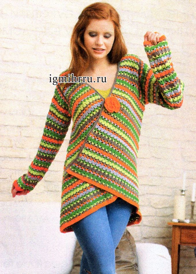 Полосатый жакет интересного кроя, дополненный шапочкой с весенними цветками. Вязание крючком