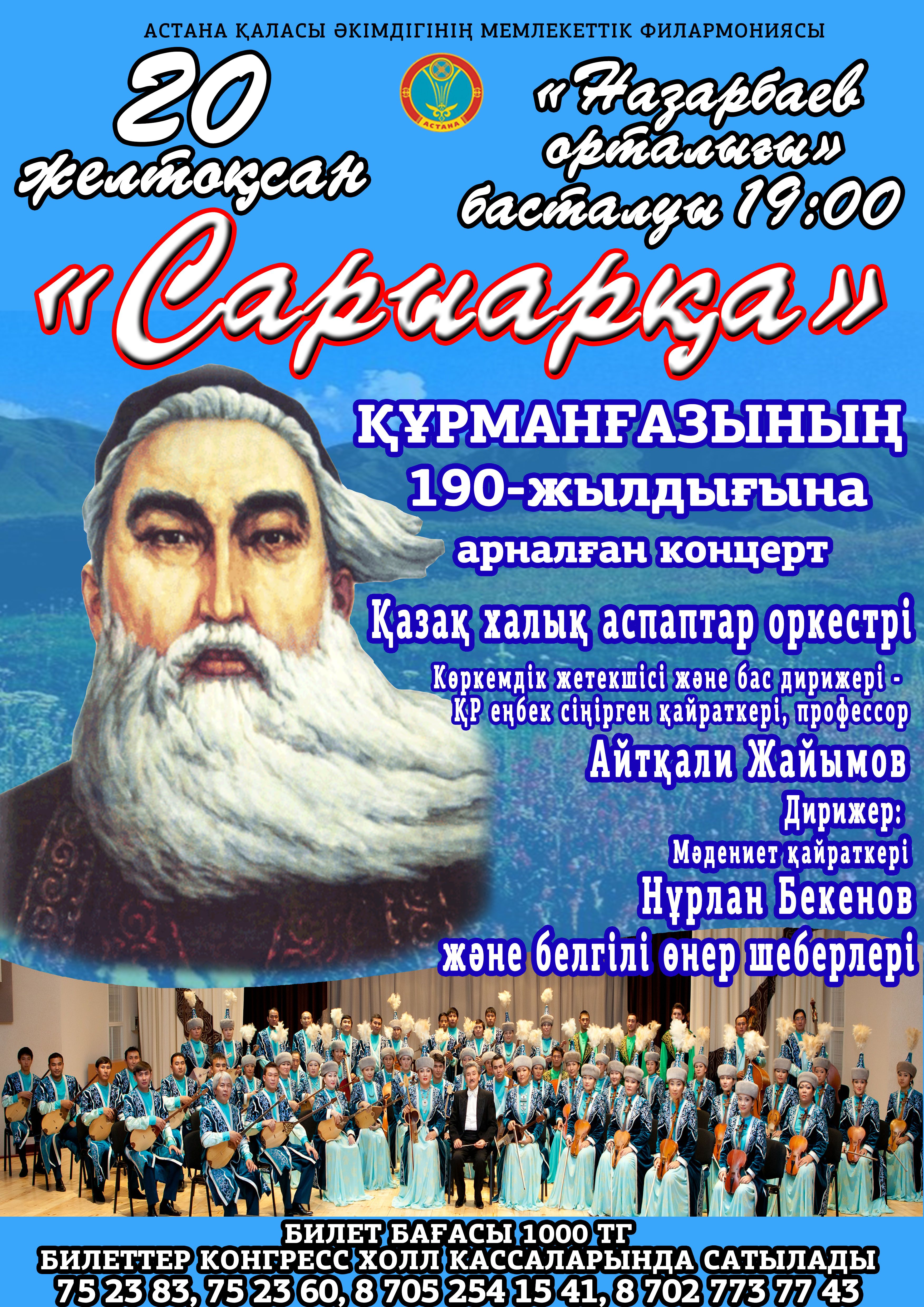 20 желтоқсан күні «Назарбаев орталығы» концерттік залында өтетін, қазақ халқының ұлы сазгер, домбырашы Құрманғазы Сағырбайұлының 190-жылдығына арналған «Сарыарқа» атты концертімізге шақырамыз. Концертке қатысады: Қазақ халық аспаптар оркестрі; Оркестрдің Көркемдік жетекшісі және бас дирижеры – ҚР еңбек сіңірген қайраткері, профессор Айтқали Жайымов; Дирижер – Мәдениет қайраткері Нұрлан Бекенов. Концерттің басталуы: 19.00